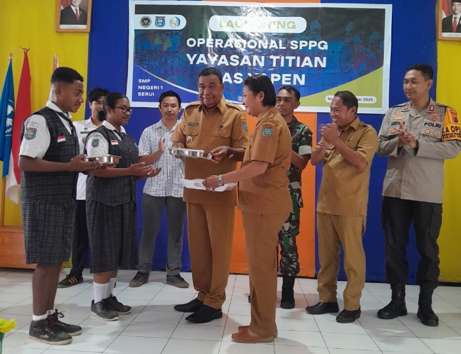 BuletinKita.Com, Serui – Bupati Kepulauan Yapen, Benyamin Arisoy, menghadiri sekaligus memberikan sambutan dalam acara launching Satuan Pelayanan Pemenuhan Gizi (SPPG) yang diselenggarakan oleh Yayasan Titian Mas Yapen. Kegiatan ini berlangsung di SMP Negeri 1 Serui, pada Senin, 11 Agustus 2025.