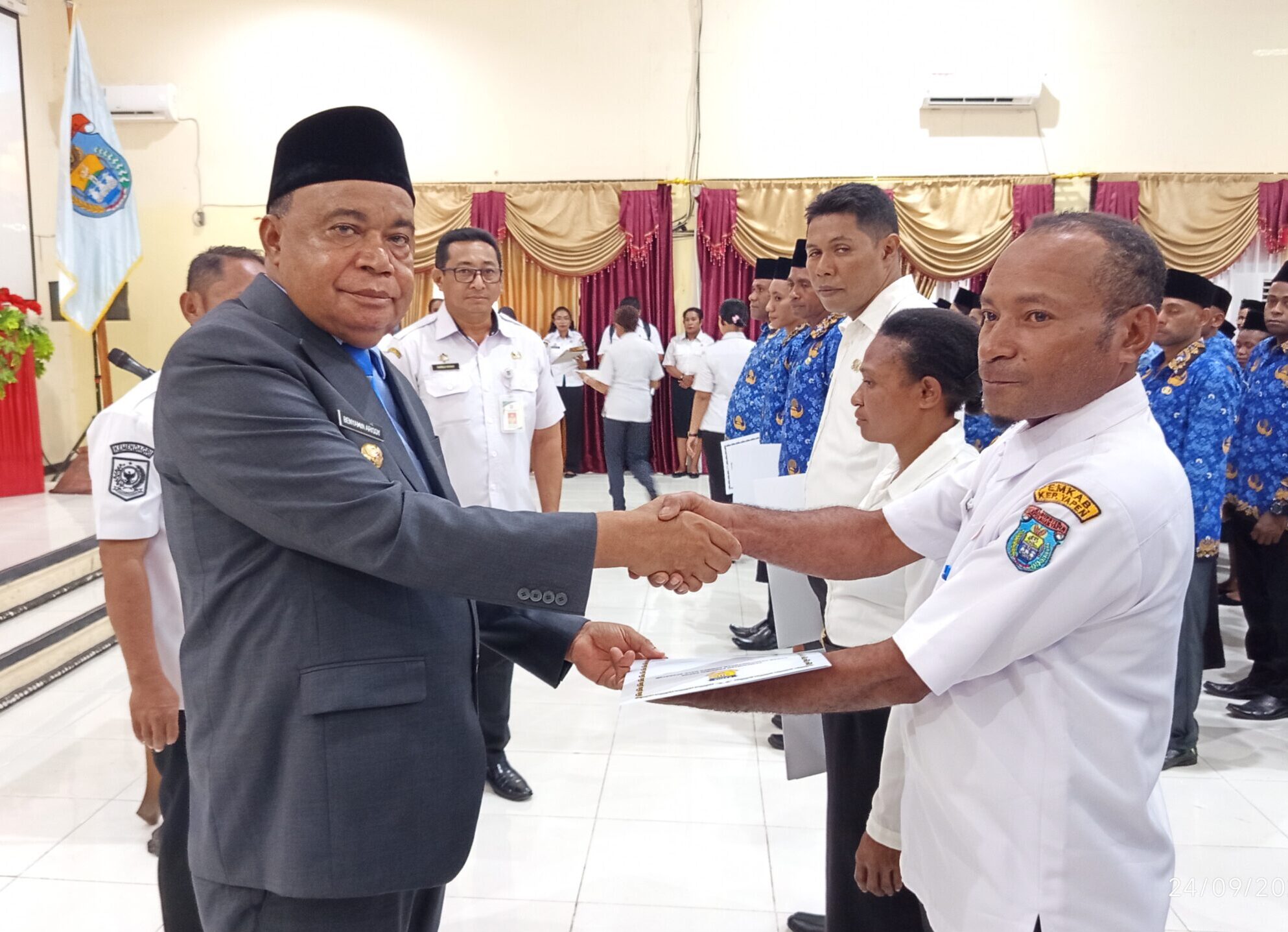 BuletinKita.Com, Serui — Pemerintah Kabupaten Kepulauan Yapen melalui Badan Kepegawaian dan Pengembangan Sumber Daya Manusia (BKPSDM) menyelenggarakan kegiatan penyerahan Sertifikat Orientasi PPPK dan Sertifikat STTPL (Surat Tanda Tamat Pelatihan Prajabatan), sekaligus pelaksanaan pengambilan sumpah/janji Pegawai Negeri Sipil (PNS) formasi tenaga honorer tahun 2021.